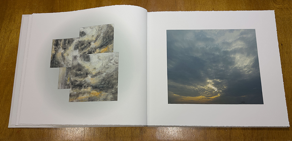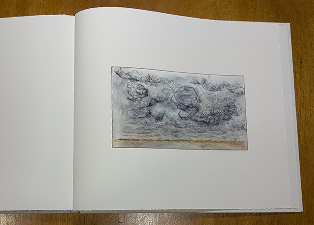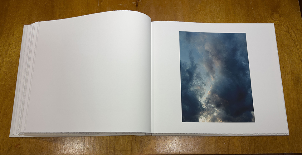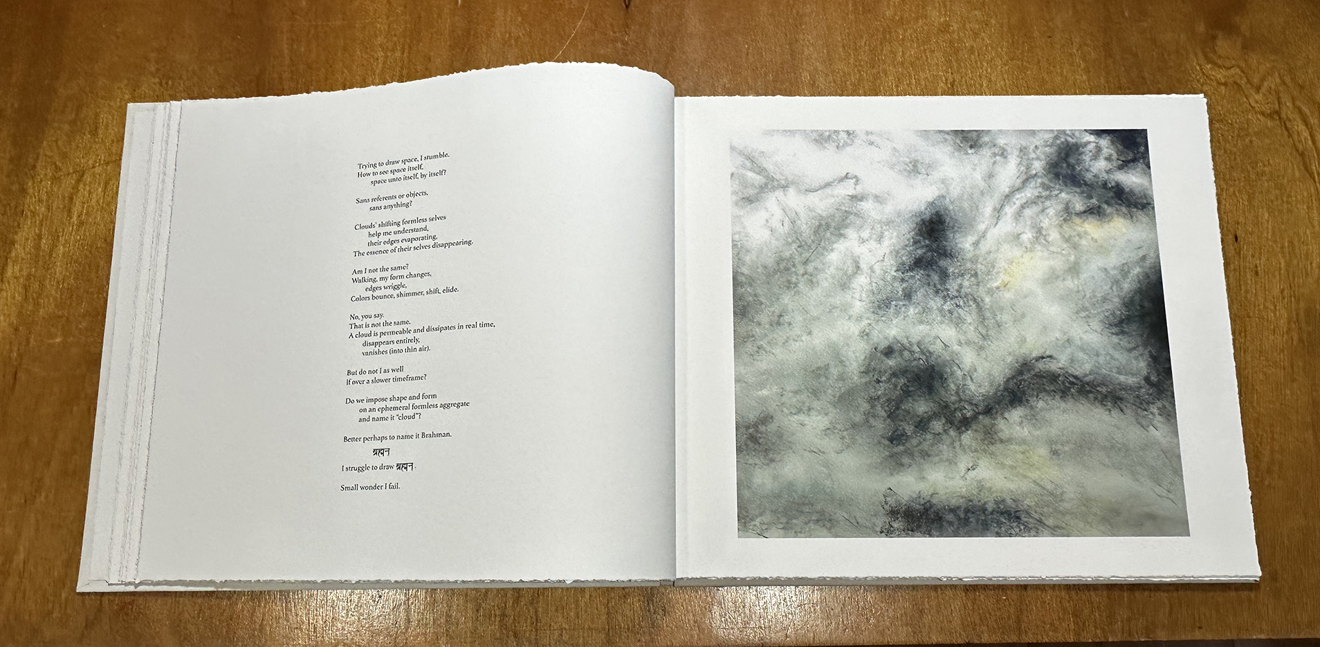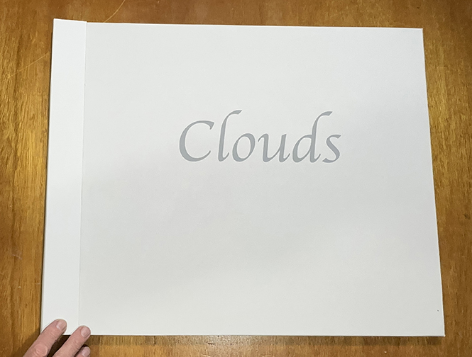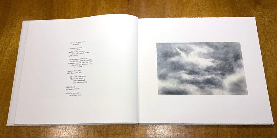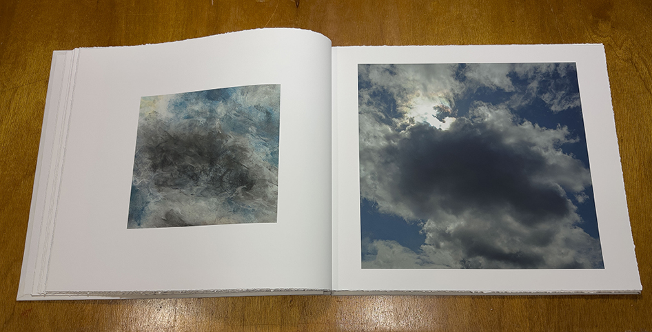 This large-format book examines our human place in the wider world of all existence as revealed to us by looking at and studying clouds. The book consists of 38 pages containing 8 poems, 20 drawings, and 7 photographs. All artwork is original. The book is printed and fabricated by hand by the artist in a signed limited edition. Each page of the book is 18"x16", resulting in 36"x16" fullspreads when opened flat. All pages are printed on heavyweight archival paper. (Moab Entrada Natural 300 gsm)