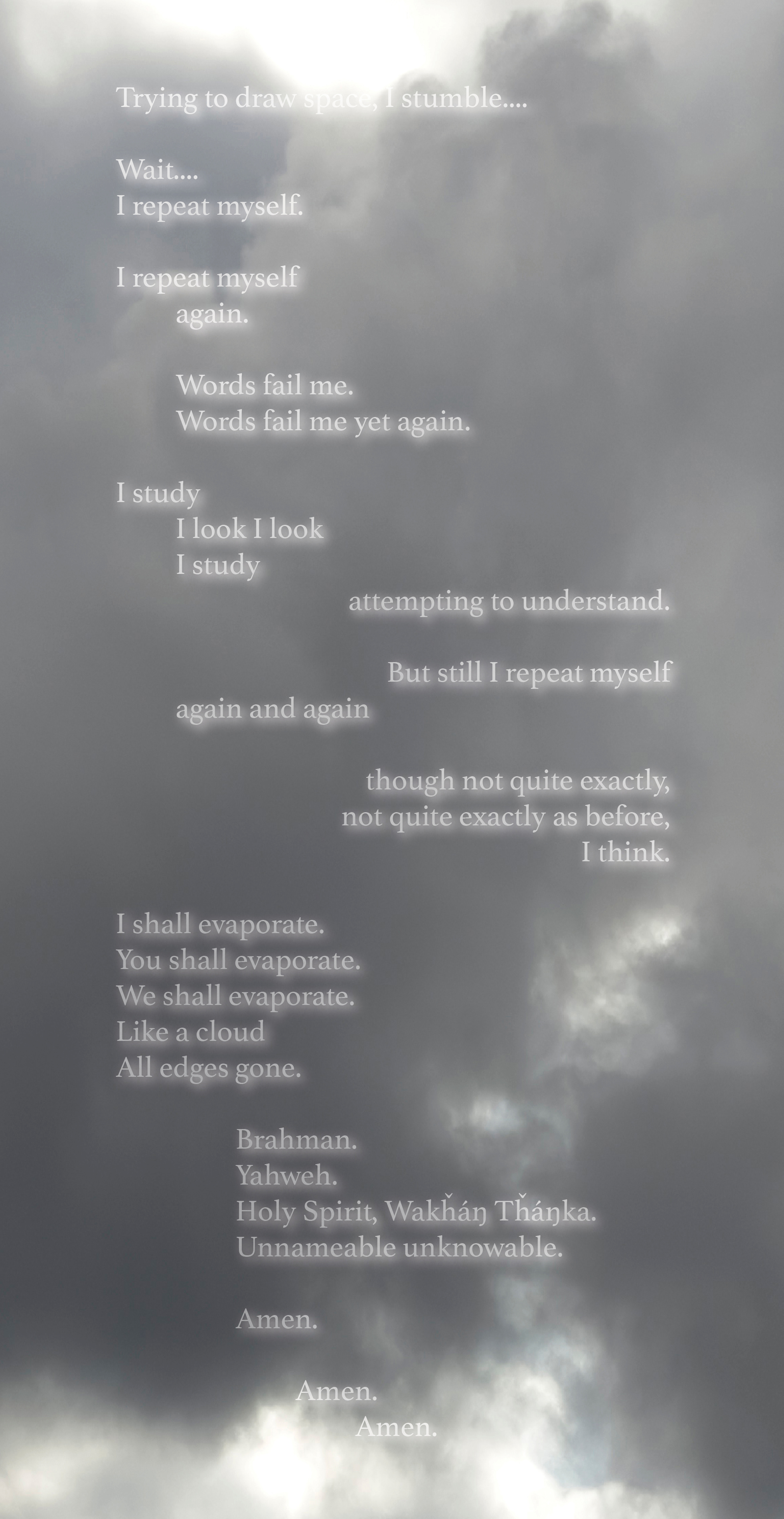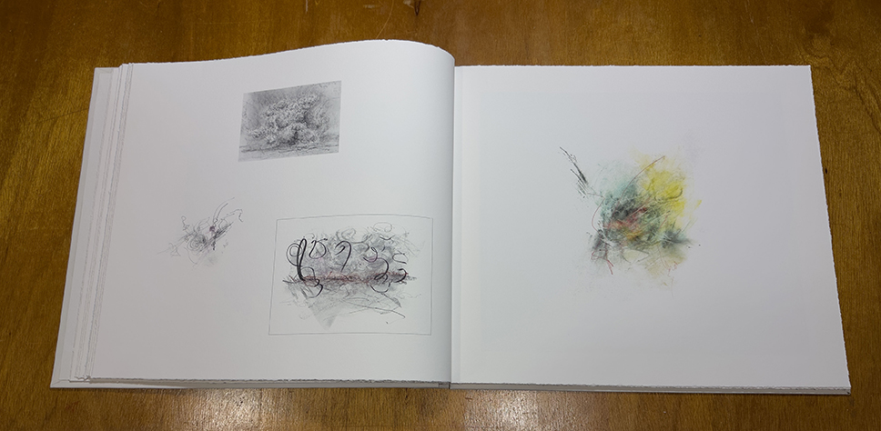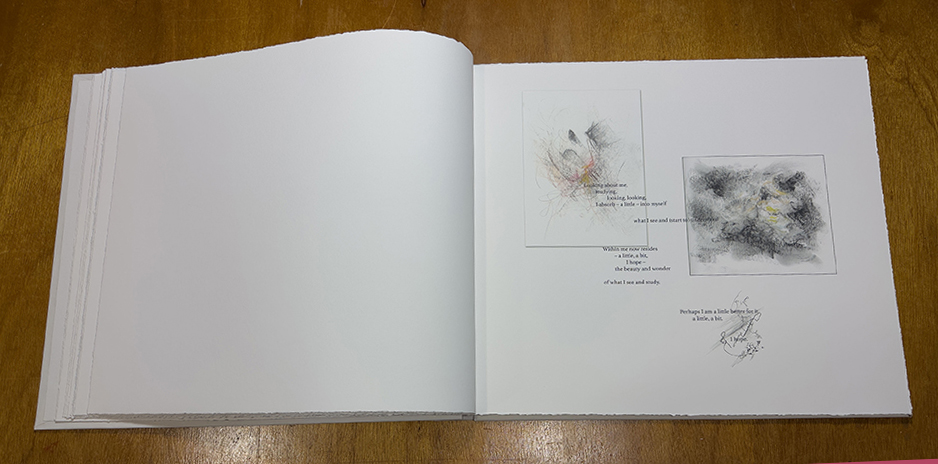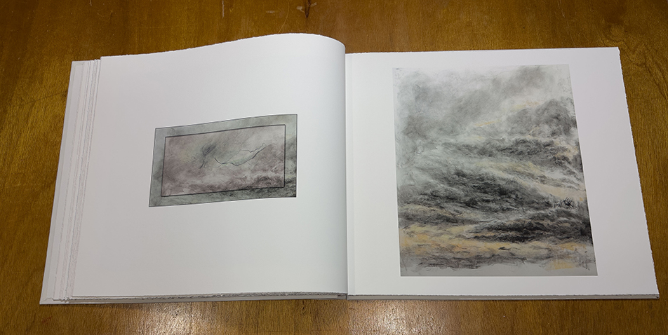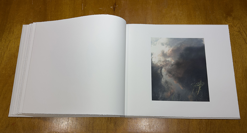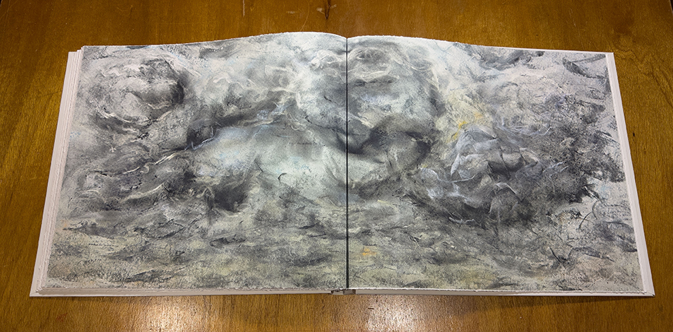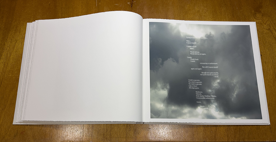 This large-format book examines our human place in the wider world of all existence as revealed to us by looking at and studying clouds. The book consists of 38 pages containing 8 poems, 20 drawings, and 7 photographs. All artwork is original. The book is printed and fabricated by hand by the artist in a signed limited edition. Each page of the book is 18"x16", resulting in 36"x16" fullspreads when opened flat. All pages are printed on heavyweight archival paper. (Moab Entrada Natural 300 gsm)