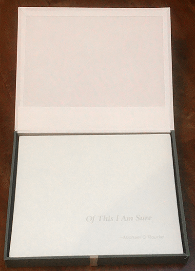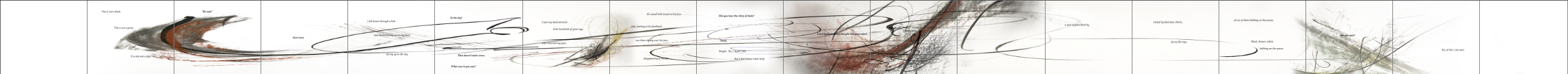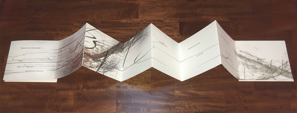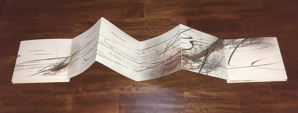 This artist book is made in accordion format. The 15 pages open up flat and can be viewed either page by page or in segments. The printed text is interleaved with printed imagery, the imagery is printed and is derived from hand-drawn drawings in ink, charcoal, pencil, and colored chalks.