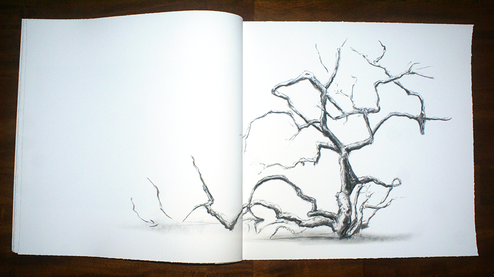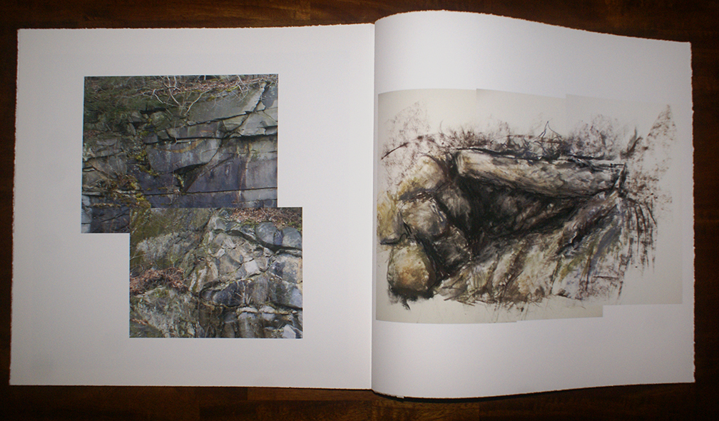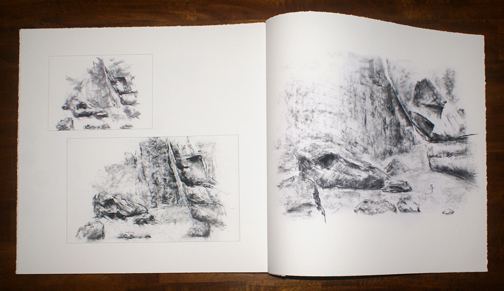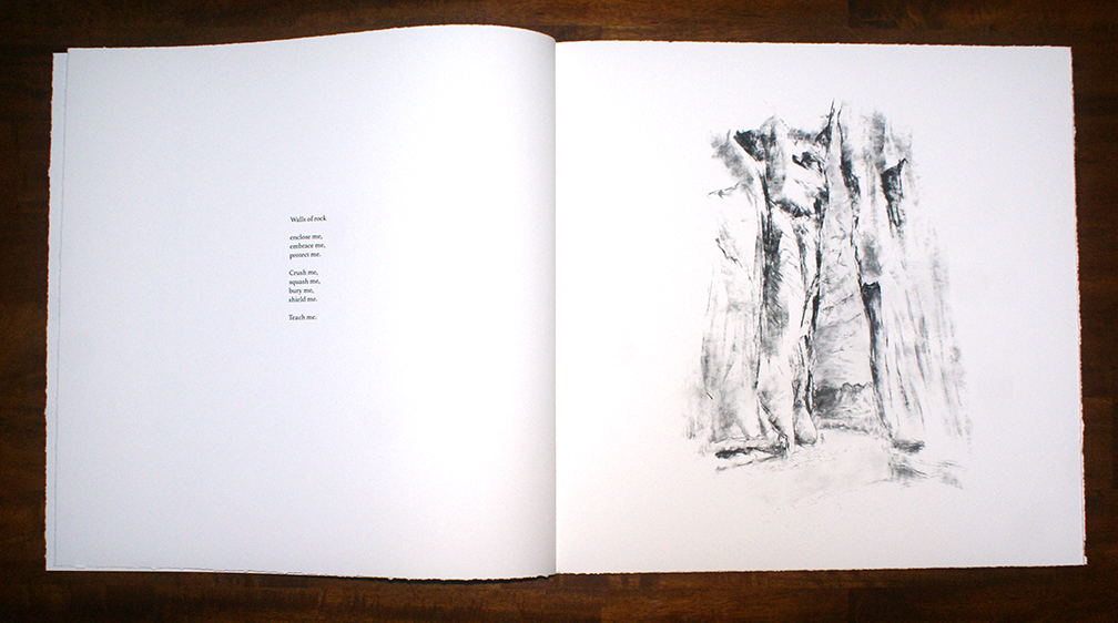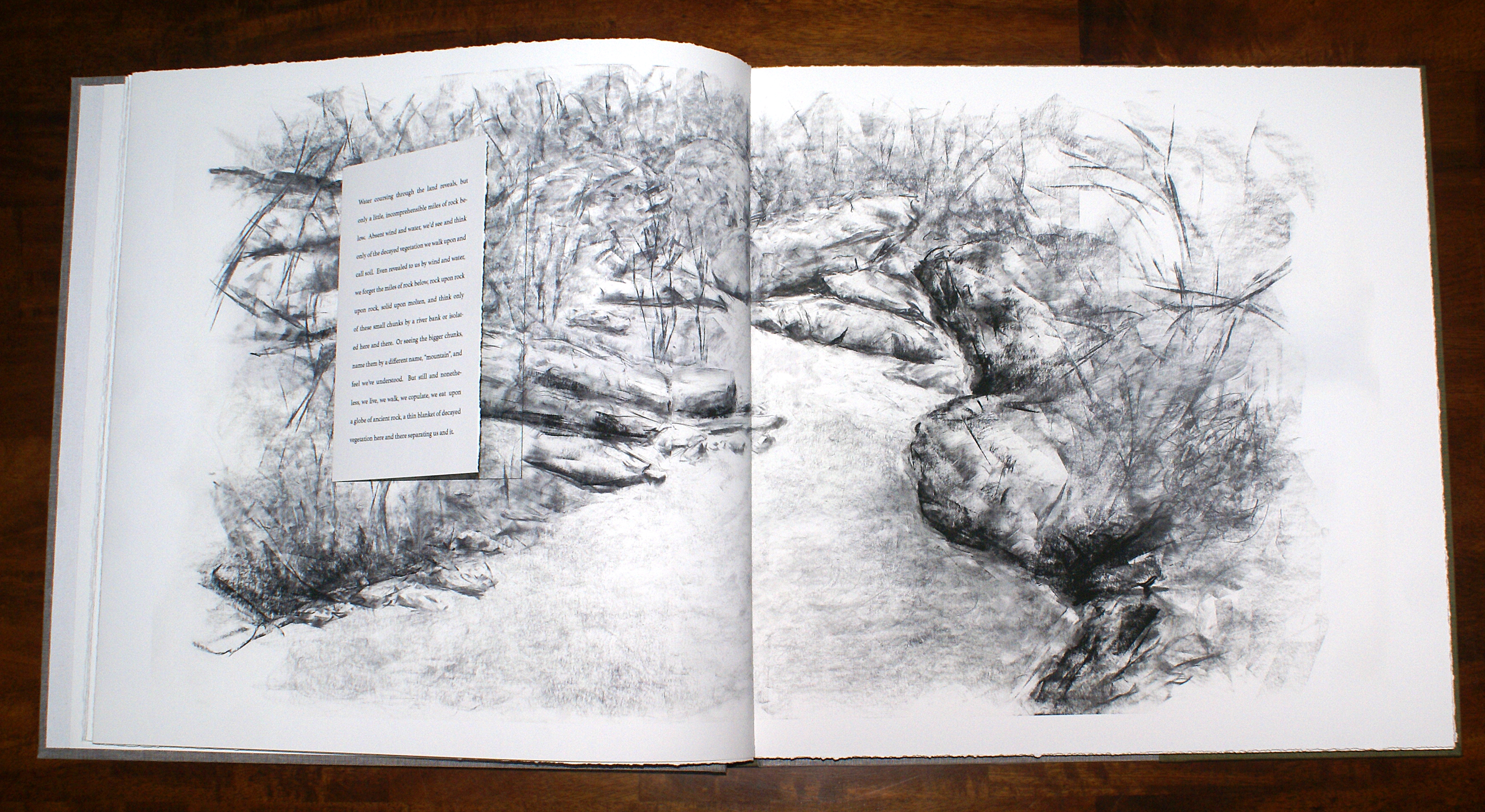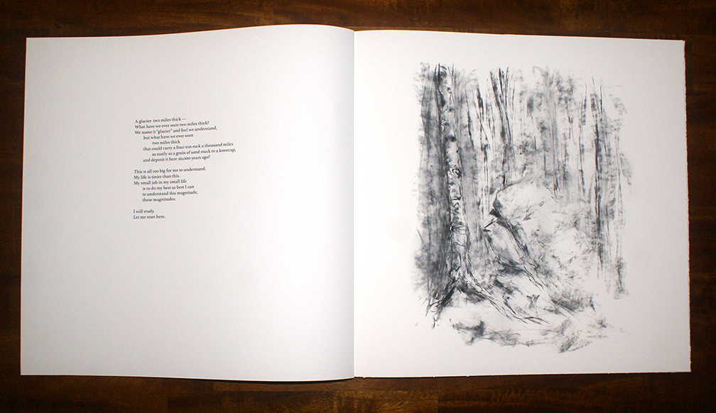 This large format book examines our human place in the wider world of all existence as that can be revealed to us through repeated and deep study of the rocks and trees that dominate our planet. The book consists of 44 pages containing 7 poems, 29 drawings, and 14 photographs . All artwork is original. The book is printed and fabricated by hand by the artist in a signed limited edition. Each page of the book is 18" x 18", resulting in very large 36" x 18" spreads. There are several foldouts within the book, including one that opens to a 50" long print. All pages are printed on heavyweight archival paper. (Moab Entrada Natural 300 gsm)