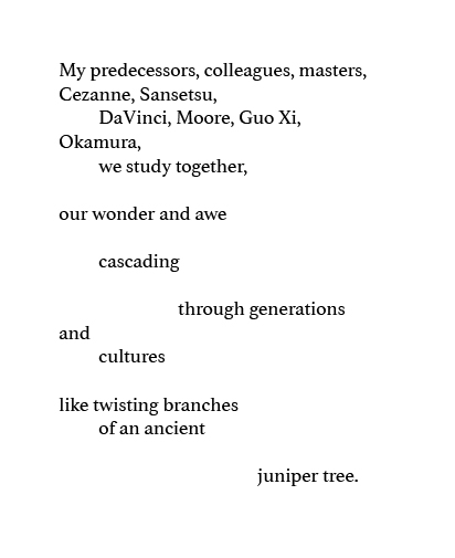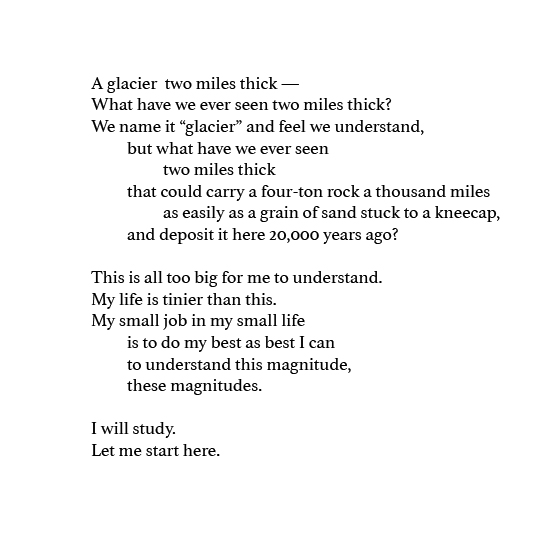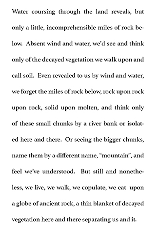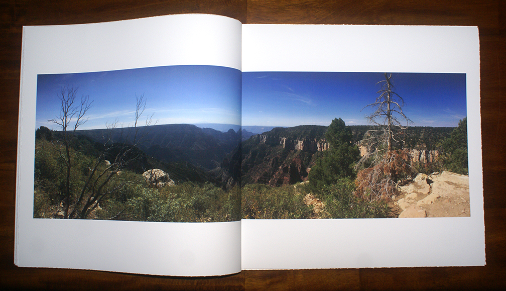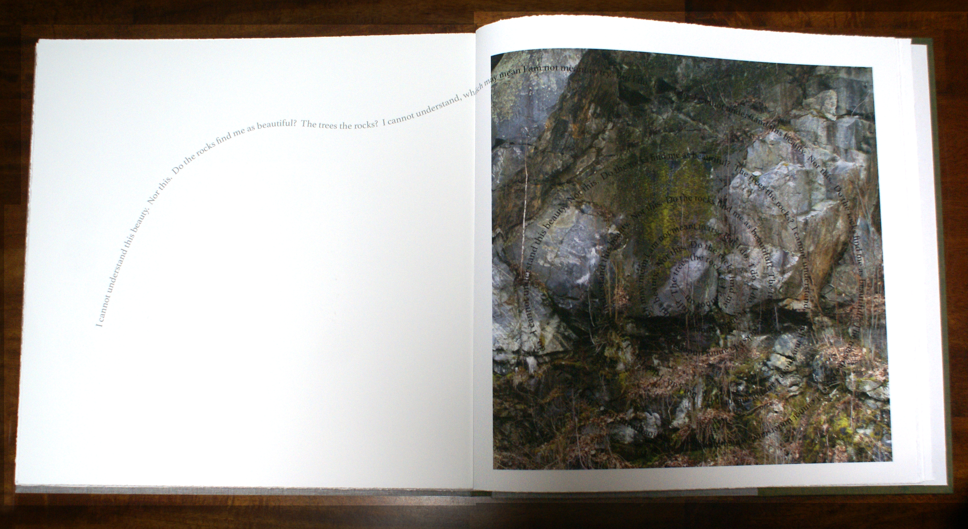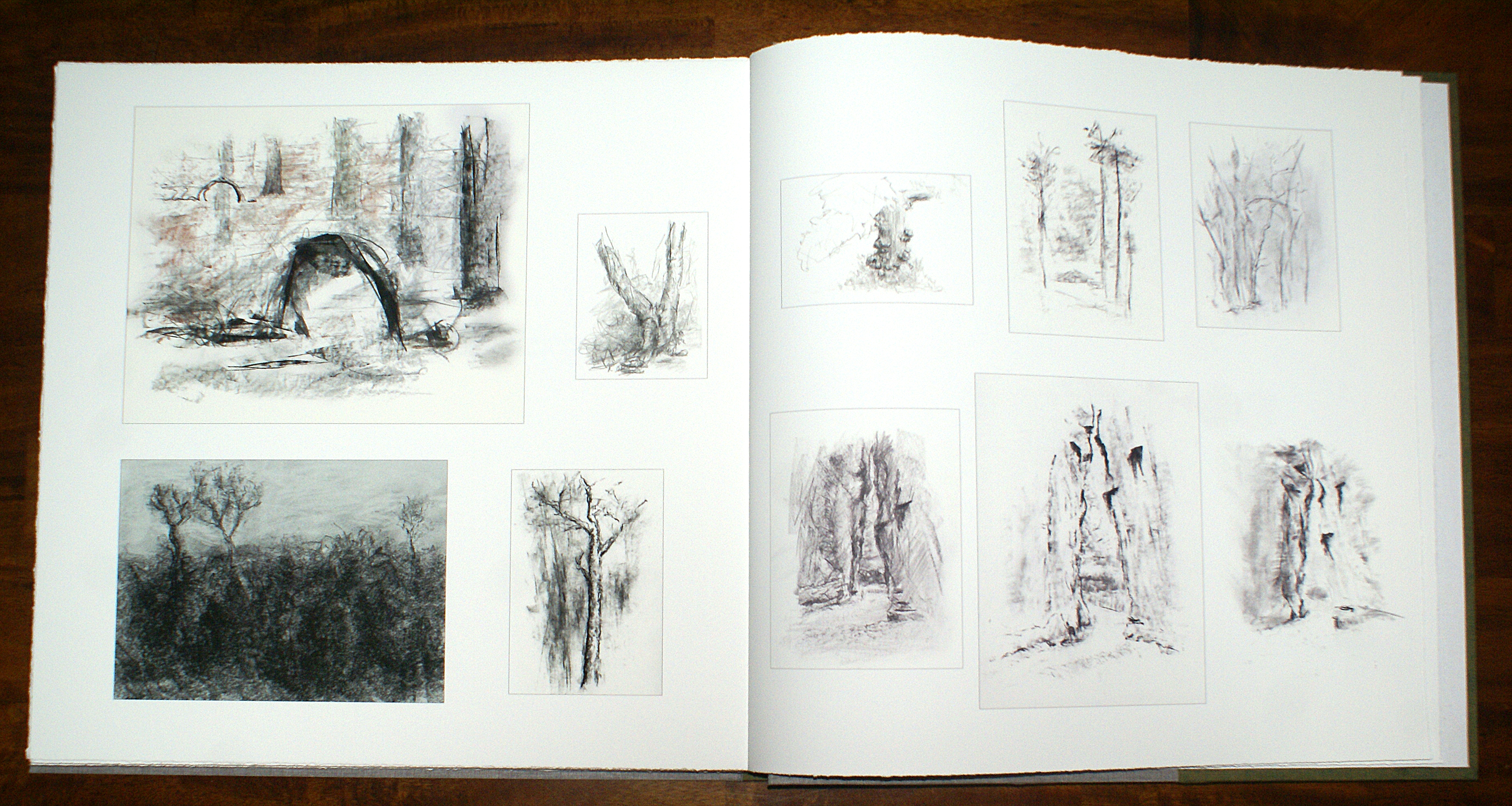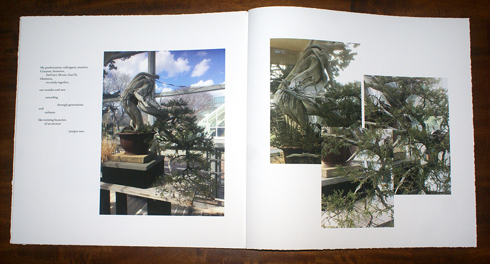 This large format book examines our human place in the wider world of all existence as that can be revealed to us through repeated and deep study of the rocks and trees that dominate our planet. The book consists of 44 pages containing 7 poems, 29 drawings, and 14 photographs . All artwork is original. The book is printed and fabricated by hand by the artist in a signed limited edition. Each page of the book is 18" x 18", resulting in very large 36" x 18" spreads. There are several foldouts within the book, including one that opens to a 50" long print. All pages are printed on heavyweight archival paper. (Moab Entrada Natural 300 gsm)