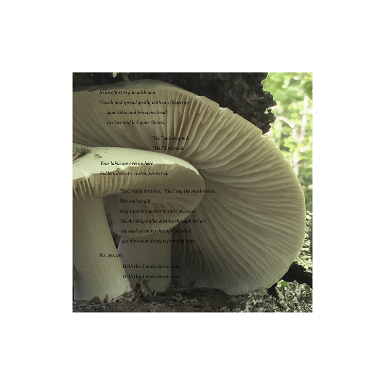 The mushroom image is printed on the same paper used throughout the rest of the book. The text is printed on a sheet of transparency which is attached to the paper and lies atop the printed image. The transparency can be lifted like a curtain to reveal the image below sans text. The poetry reads: