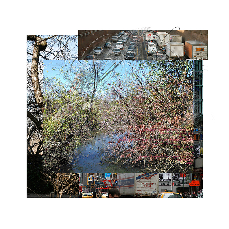 The poetry is printed on top of the imagery. The color of the text is very similar to the colors of the vegetation behind the text, camaflouging the text and making it extremely hard to read, thereby echoing the idea of tiny lifeforms we can only see with greatest difficulty. The poetry reads: