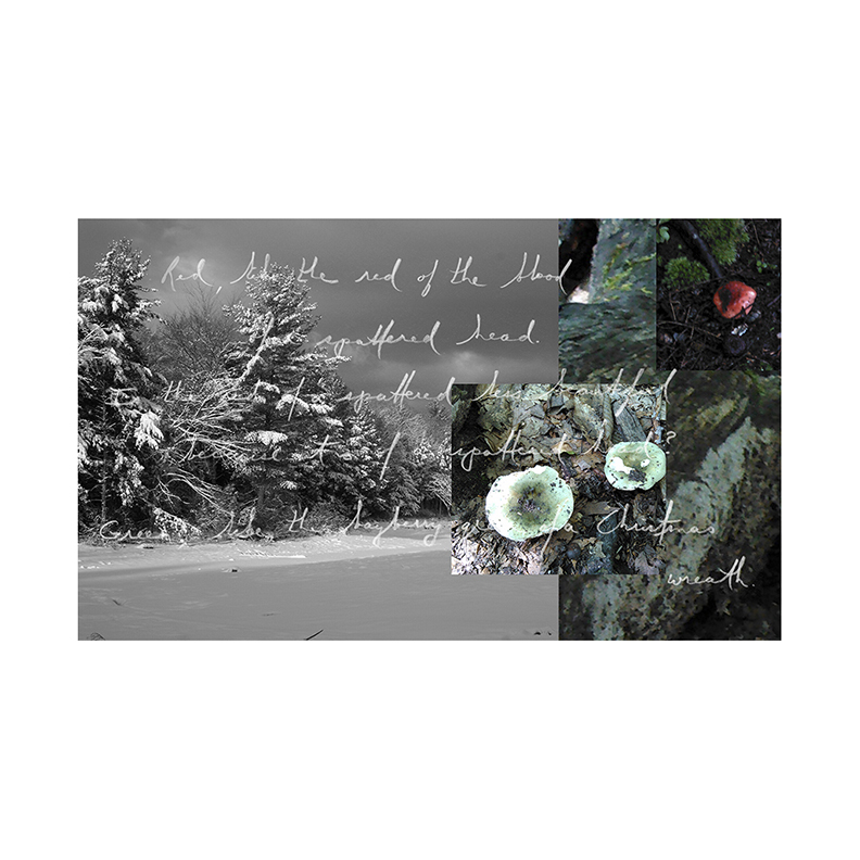The poetry is hand-written in white ink on top of the printed imagery, and reads: