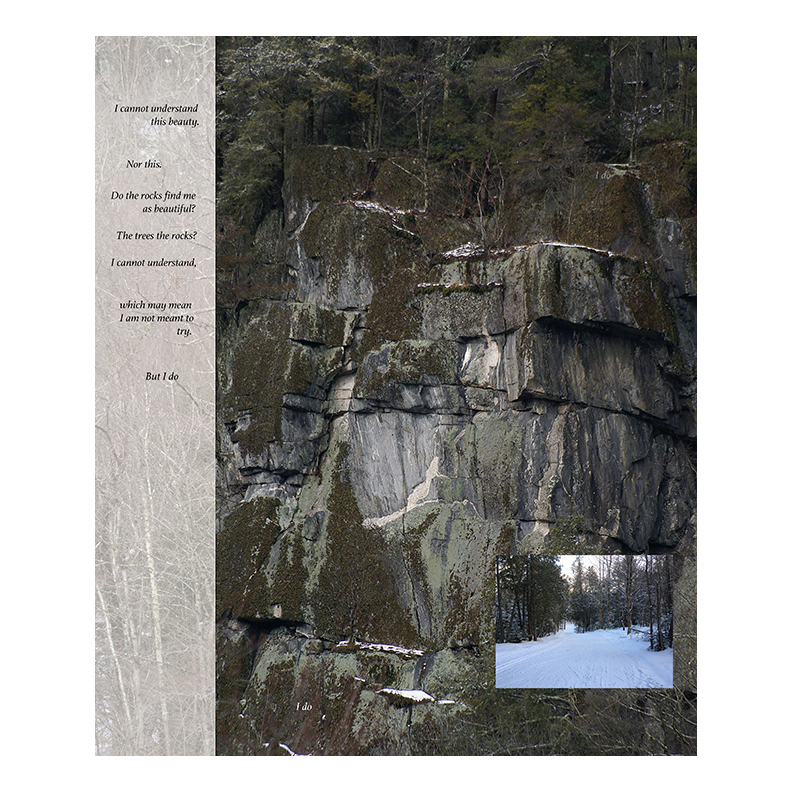 The text in the left column is printed. The final two lines are hand-written in ink over the rocks image. The poetry reads: