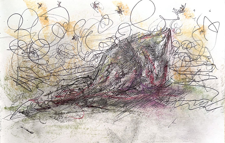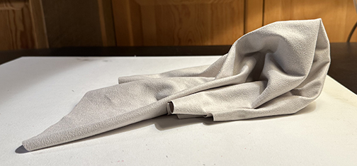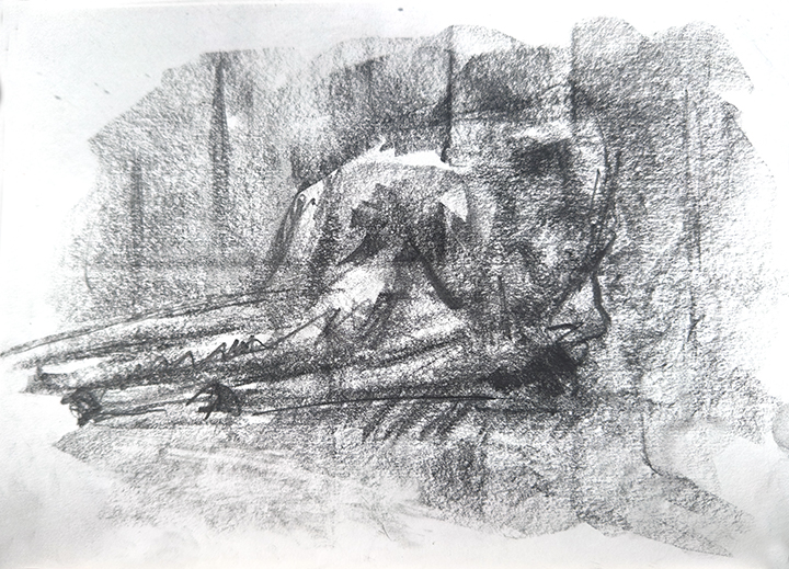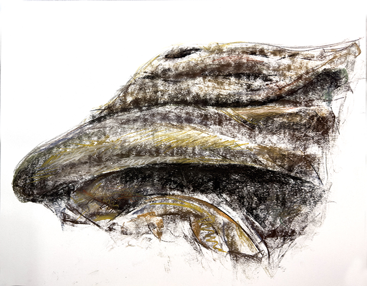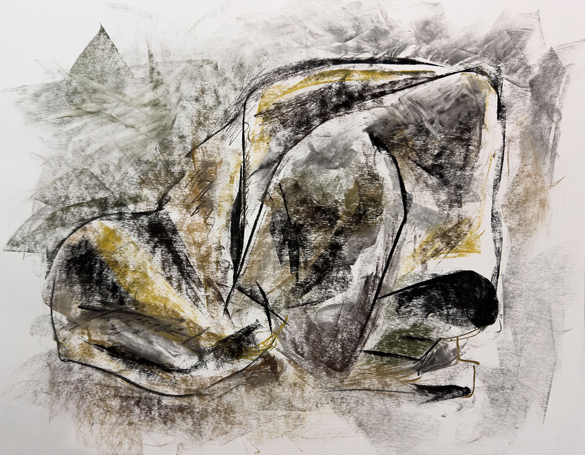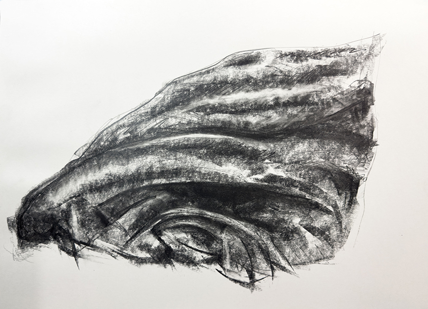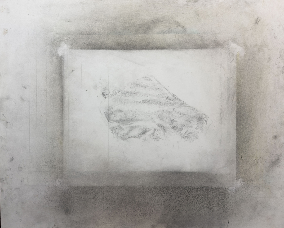 First versions were done in charcoal from a photograph and are more mimetically realistic. Subsequent versions diverge more from the original and were in other other media (graphite, Conte, pastel) and focus more on the graphics and less on the mimetic realism. Some of the subsequent versions were drawn referencing the previous drawing rather than the photograph of the cloth; others were drawn entirely from memory. Most of the drawings were done on 24" x 20" Bristol board paper.