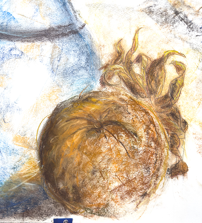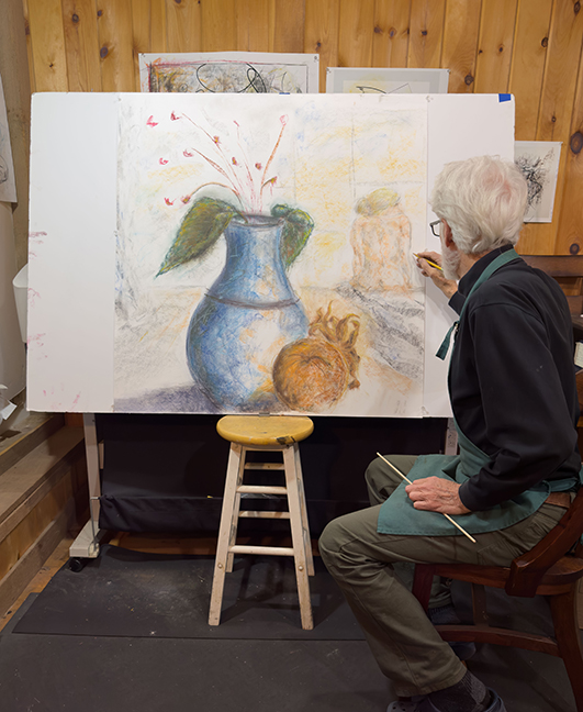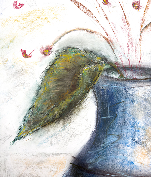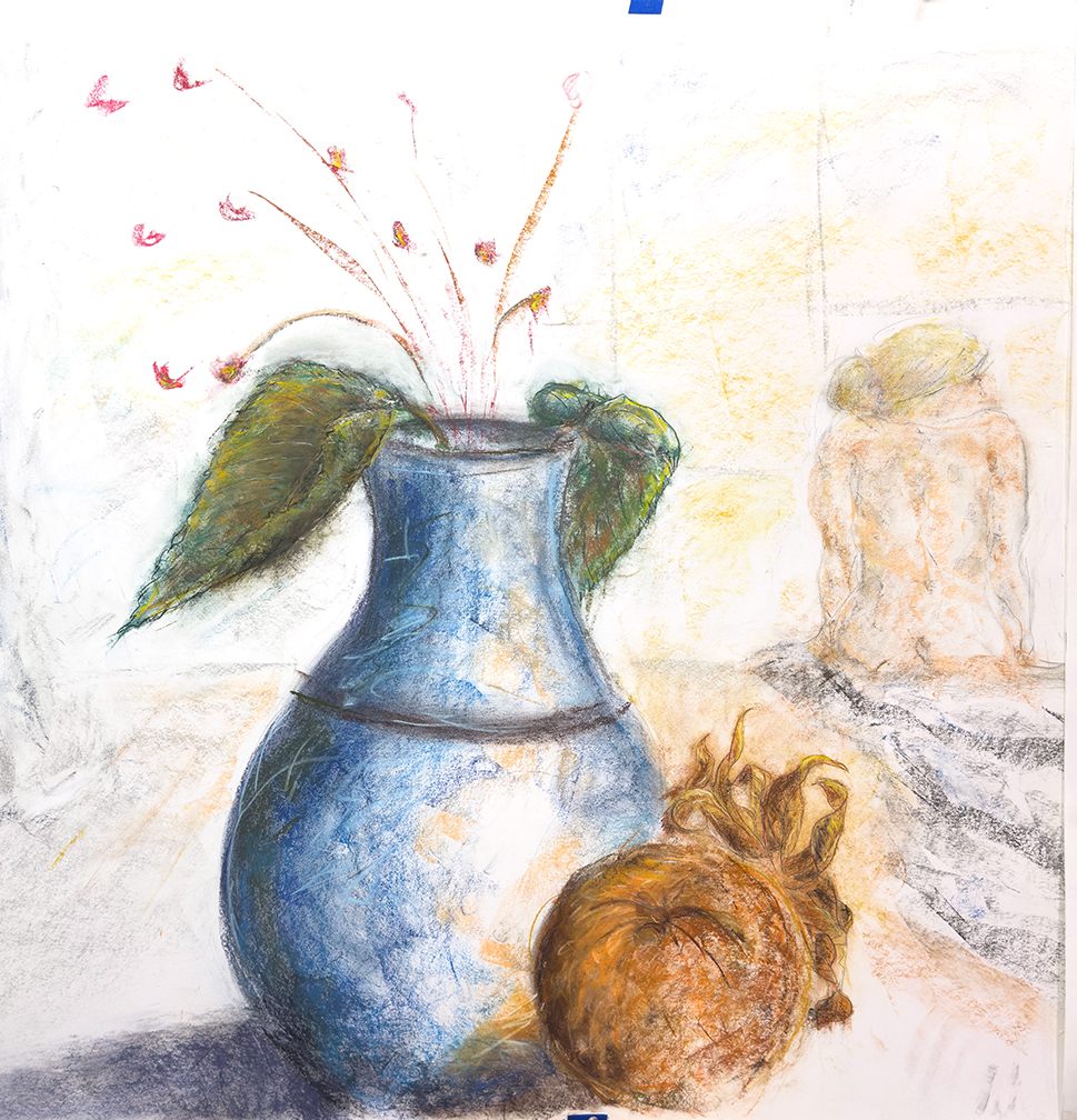 The large, detailed drawing of the vase (the vase itself, without flowers or leaves, is 24" tall) in the foreground dominates our perception. The human figure, which we might normally expect to be the focus, is faint, roughly drawn, and in the background -- insignificant compared to the vase.