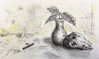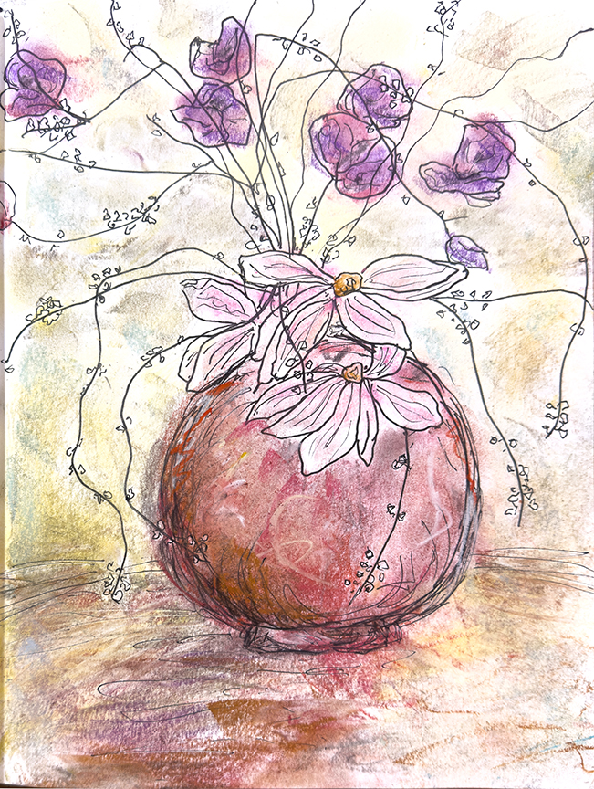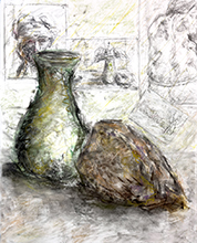 Prompted by several "Intro to Drawing" courses I offered, I began doing drawings of still life compositions. Some of these involve simple objects, in a traditional still-life approach. Others include drawings of the human figure done from memory and/or other objects drawn from memory or imagination. SIzes range from just a few inches to several feet.