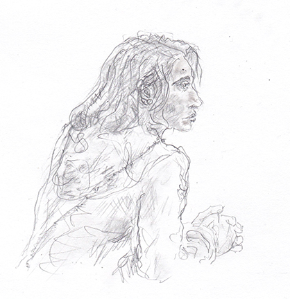 While taking a photo of my partner at a public garden, this young woman and her friend happened to be at the edge of the frame. While her friend busied herself setting up her camera, the young woman sat quietly behind her, gazing off into space and thinking who knows what. My goal in doing these studies was to try to understand what it is about the subtleties of a face -- shapes, contours, swells, hollows, proportions -- that cause us to think it beautiful. Sketches below were based on the accidental photo at the garden.