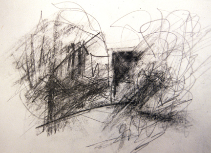The first drawing, top, was done while looking at the scene. The second, below, was done immediately afterward without looking at the scene, in order to achieve a more abstracted, purely graphic representation. |