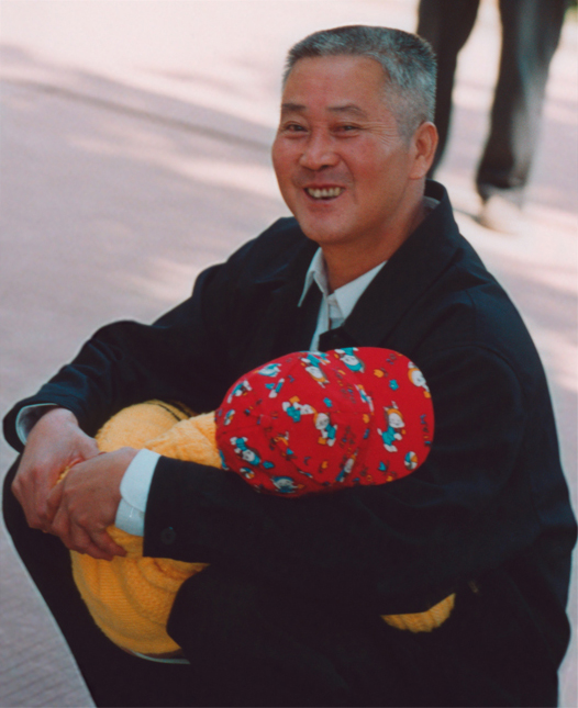 A man holding a young child. The color of the ground in the background echoes the colors of the sky above the ocean in the main composition. At the top of the frame, two legs, echoing the shapes of the two lines drawn to the left of the Bodhisaatva image in the main composition. The bright red, blues, and yellows of the child's clothing point to the bright colors of the "painting" area to the right of this image and the bright, saturated colors of the small bathers scene.