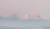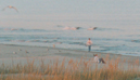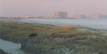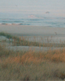 Looking across the sand dunes and across a stretch of ocean, in the distance a city, gleaming in the evening sun.