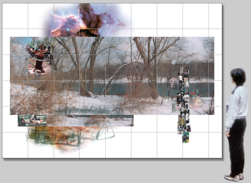 The scale of the image is mural-sized - 8' x 11.4' (2.4m x 3.5m). Fabrication is of printed tiles mounted on lightweight boards. Total weight of mural is approximately 50 pounds.