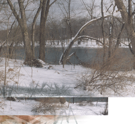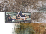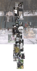 This mural-sized composition is a close variation of two other images in this series - River and Small River. Like them, it combines images of a river amidst snow, people on the streets of New York City, two nebulae as shot by the Hubble Space Telescope, a dancer in a Chinese park, a man and his son sleeping on a bench, and hand-drawn pencil sketches. The scale of the image is mural-sized - 8' x 11' 5" (2.4m x 3.4m). Click to see a scale representation of the mural. (Click a section to see details.) |