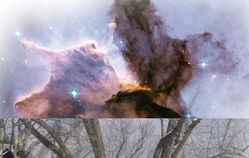 The Eagle nebula (a collection of dust particles in outer space), as imaged by the Hubble Space Telescope. Above, and continuing the motion of, tree branches in winter.