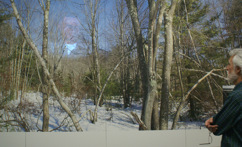 The printed imagery of Woods shows a dense woods in snow. Superimposed are two sub-images — one a busy construction site in Manhattan with pedestrians entering and leaving the construction tunnel, the other a child’s doll in bright sunlight on the edge of a bathtub. The quotidian and very human content of these two sub-images jars with the striking natural beauty of the woods and causes us to ask a central question of this artwork: How does this make sense with that?