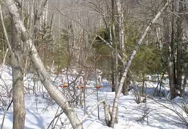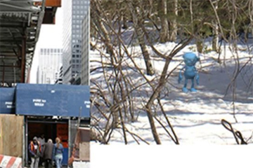 Projected onto the surface of the mural at random times are several animations. They are comical, cartoony, even ridiculous, using well-known freeware characters engaged in short, odd behaviors that contrast with the sublimity of the woods imagery. One shows three “Package Men” in red underwear dashing among the tree trunks of the woods. Another shows an “Andy” figure falling out of the top of the image, tumbling down a tree trunk, dropping to the ground, brushing himself off, and walking calmly off-screen at the bottom of the image. Another shows "Generi Guy" popping up out of the snow, looking down at the Manhattan scene, shrugging, and hustling off through the trees and out of the mural. A final image is more subdued. A realistic human figure walks out of the construction tunnel, behind that sub-image and across the snow, disappearing behind a tree trunk. Several minutes later, it emerges and walks into the distance and disappears into the woods. All of the animated figures are the size of squirrels or chipmunks relative to the trees. Because the animations are small, silent, and occur randomly, a viewer may miss the animations entirely. Only if we are very patient and bide our time and look very carefully can we begin to understand the mural.