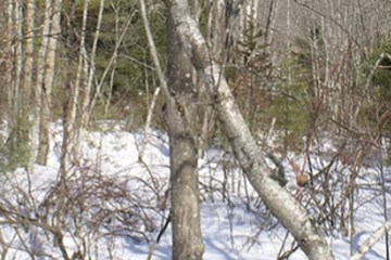At random, unpredictable moments, about once every 2 to 3 minutes, a short animation unexpectedly appears projected onto the surface of the mural. Each animation consists of a character (or several) moving through the space of the woods. The characters are tiny -- the size of chipmunks relative to the trees. In actual dimensions, they are 4" - 5" tall. Though their two-dimensionality is intentionally obvious (they are unabashedly projections), they appear to move through the space of the woods because they are hidden/occluded by the trees in that image as they move through the imagery of the woods. Western art's centuries-old concern with mimesis, with representing three-dimensional space through a two-dimensional image -- what Arthur Danto called "the Vasarian narrative" -- is toyed with here. The two-dimensional photographic image of the woods represents quite convincingly a three-dimensional space. On the two-dimensional surface of that image are projected two-dimensional characters -- who quite convincingly move "through" the blatantly two-dimensional representation of the three-dimensional space.