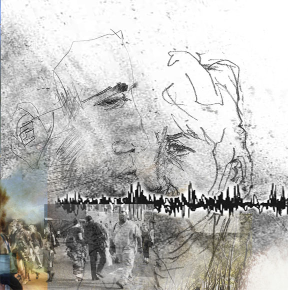Drawings of some people. Below them, photographs of people from the Union Square area. The drawings were originally done in pencil, then scanned and enlarged.