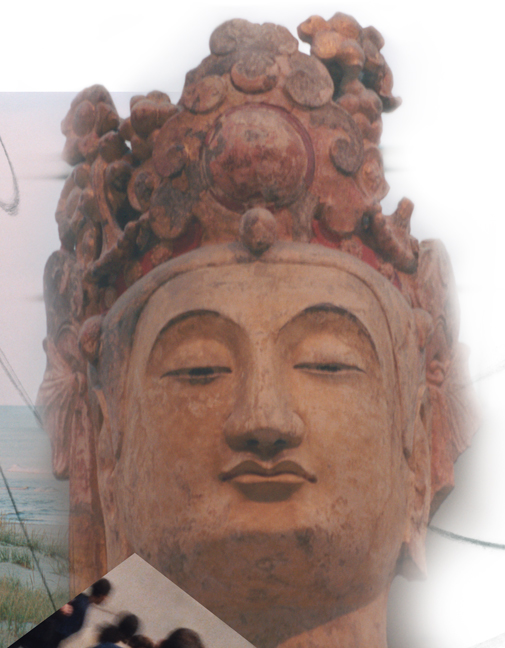An image of a Bodhisaatva, from an ancient Chinese statue. This dominant vertical both splits the composition left and right and unifies it. The terra cotta colors of the figure are picked up throughout the composition - in the oranges of the Wall Street image below, in the ochres of the beach grasses, in the oranges of the people in the column to the far right.