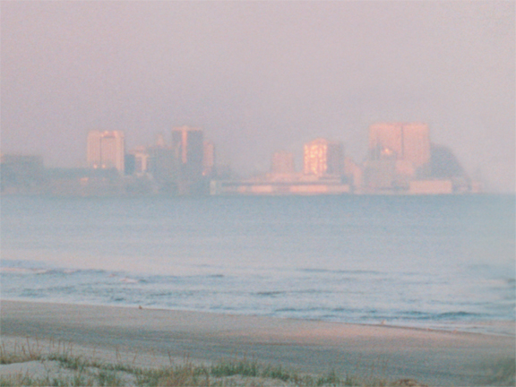 A city built on the edge of the ocean, gleaming in the pink light of twilight.