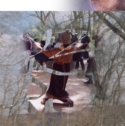 A woman dancing. The photo was shot in a park in China. Her movements intermix with the branches of the tree image. Erasures through her image echo (and reveal) the tree branches.
