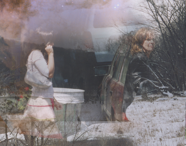 Two women on the streets of Manhattan. The image of them blends with two superimposed images of the river.