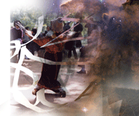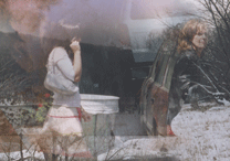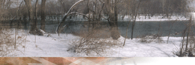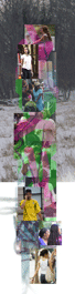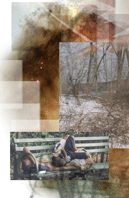 This composition combines images of a river amidst snow, people on the streets of New York City, two nebulae as shot by the Hubble Space Telescope, a dancer in a Chinese park, a man and his son sleeping on a bench, and hand-drawn pencil sketches. This composition is a close variation of two other images in this series - Big River and Small River. Click a section of the image to view details. |