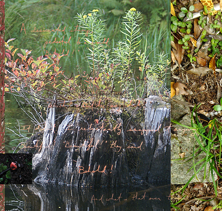 The poetry is hand-written in various inks and paints on top of the printed imagery, and reads: