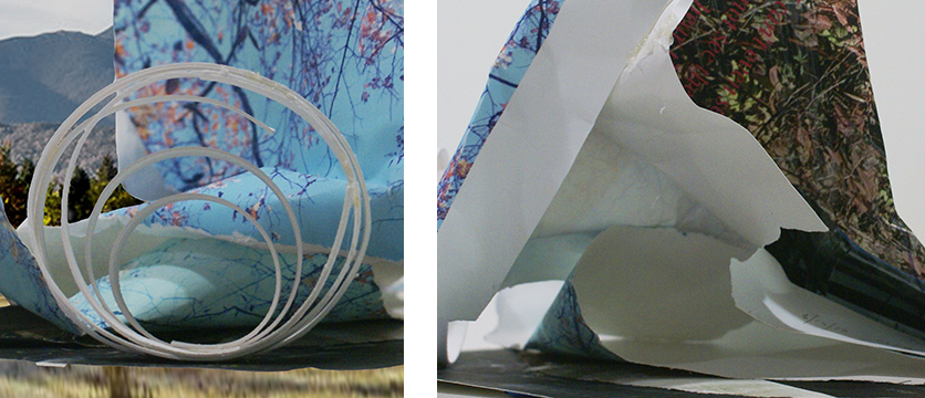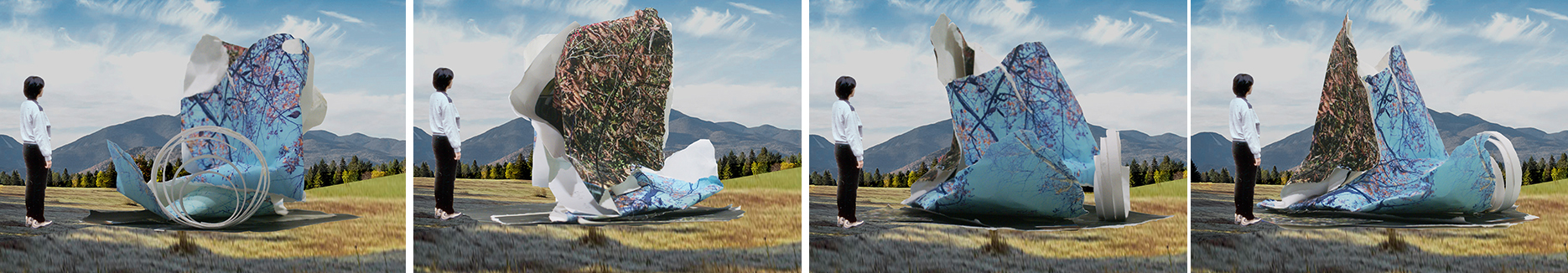 The entire sculpture is exhibited outdoors against the backdrop of mountains. Because of its impermanent and fragile materials, it is gradually reclaimed by the winds and rains of the same environment that helped make it beautiful. The paper and board collapse and deteriorate, the multimedia components fail and cease to function. The artwork returns to the raw materials from which it was fabricated.