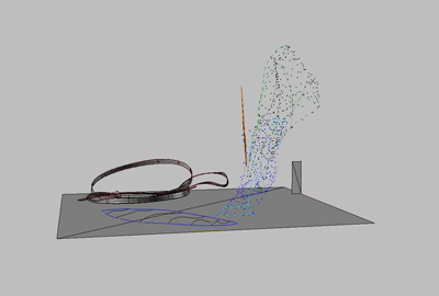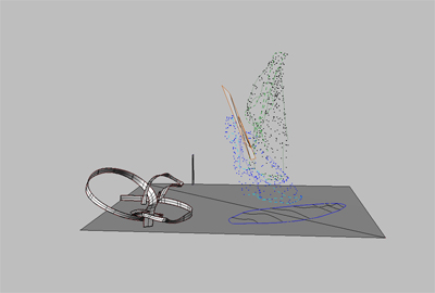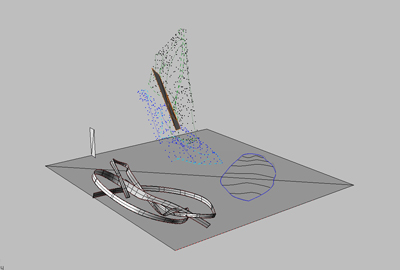 | Live processed video runs along one side of the needle element. Along the other, a hand-drawn/painted drawing. The video shows close-ups of the people in the vicinity of the sculpture. Hidden video cameras are embedded within the sculpture to pick up this live video. |