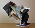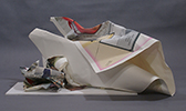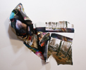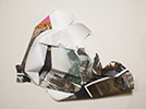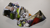 Sculptures and reliefs made of printed paper. Prints on paper are crumpled, folded, torn, glued. The categories we normally use when we make or view art fail. Is this a "print" or a "sculpture"? Sculpture is normally conceived as physically substantive, durable; these are as fragile as – a piece of paper. The imagery is primarily photographic but is not being treated with the reverence photographs are normally accorded; the photographic images are not framed, mounted, or even readable. The mimetic quality of the imagery is largely lost, but occasionally peeps through. The imagery, crumpled and folded, collapses to pure color and form, almost absent any "content". Or does it rise to those? How do we see our world? How do we process what we see? If we stop thinking and just look, does it not all become color and form? And whether we understand it or not, can we see it as, simply, beautiful?
