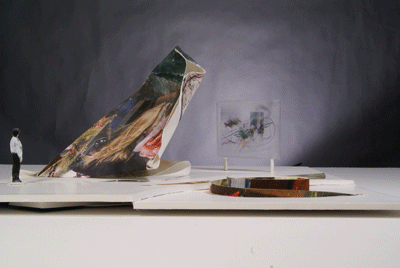 On a slightly lower level from the larger forms, a coil form is covered in photographic imagery. The coil is wide enough to serve as a bench for viewers. The large transparent rectangular screen displays an image, a portion of which is live video. This live-video subwindow floats randomly through the rest of the imagery on the screen. |