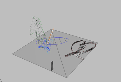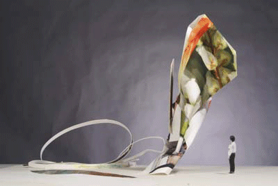 | Live processed video runs along one side of the needle element. Along the other, a hand-drawn/painted drawing. The video shows close-ups of the people in the vicinity of the sculpture. Hidden video cameras are embedded within the sculpture to pick up this live video. |
