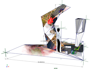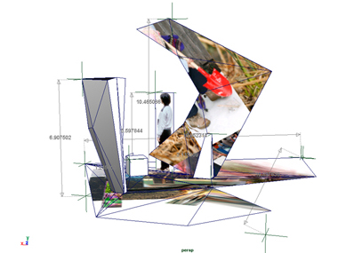 The compositions begin digitally in a three-dimensional software package. The polygonal forms created there are unwrapped with another software into flat patterns which are printed, along with their image textures, onto paper. The paper prints are assembled to form a small preliminary paper model corresponding to the virtual digital model. The process iterates between paper models and virtual models until the composition is satisfactory.