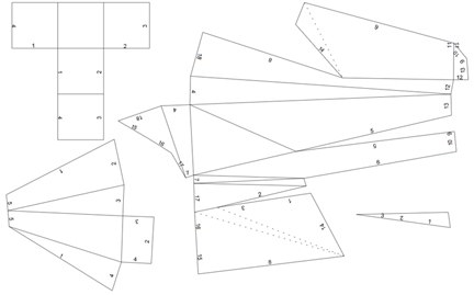 The digital data can then be scaled up to the full intended size (approximately 9' tall) and the flat patterns, along with high resolution versions of their imagery, printed at this full size on paper. Each full-size paper print is glued to a sheet of foamboard, which is then cut into the shape of each facet of the sculpture. The edges of the foamboard facets are beveled according to angles calculated in the software. The facets are then attached together edge-to-edge to build up the final form. For dis-assembly, the facets are detached and packed and stored flat.