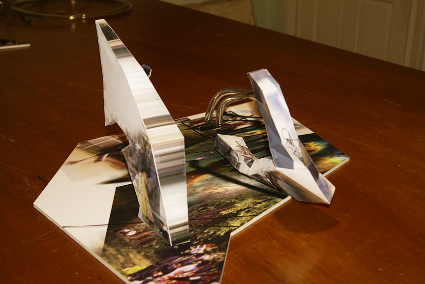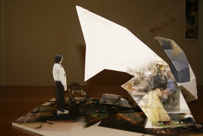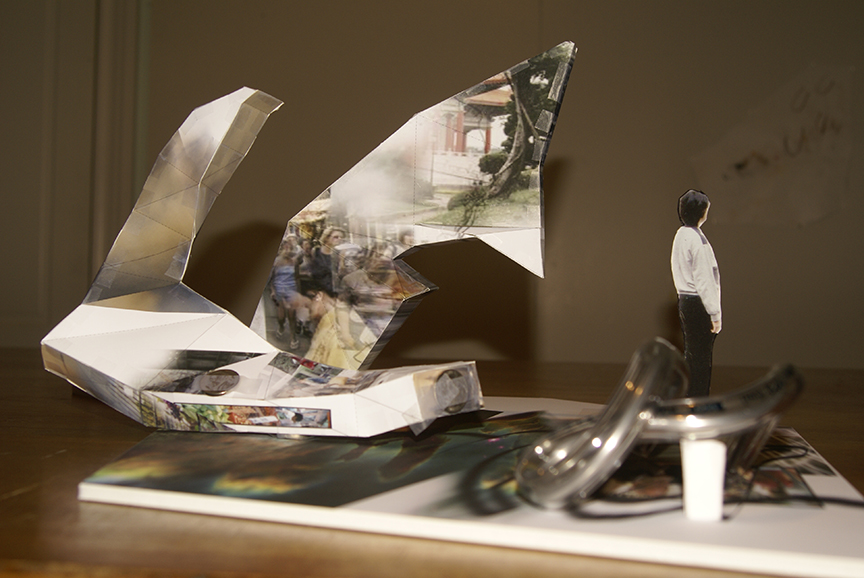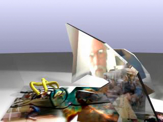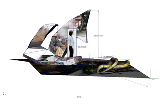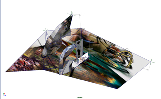 The images here show various views of the digital version of this composition. The human figure is inserted as a scale reference. Several of the large white sections of surface are intended to receive projected live video. Simulations of the live video can be seen in the turntable animation to the right and in the renderings at the bottom of this screen.