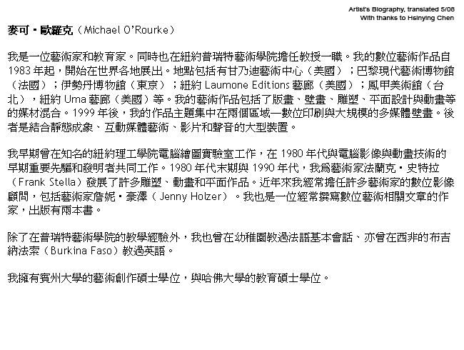 Michael O'Rourke is an artist, author, educator and Professor at Pratt Institute in New York City. His digitally generated artwork has been exhibited and screened around the world since 1983. Venues include the Kennedy Center for the Arts (Wash. D.C), the Musee d'Art Moderne (Paris), the Isetan Museum (Tokyo), Laumont Editions (NY, NY), the Hong Gah Museum (Taipei), Uma Gallery (NY, NY), and many others. His artwork has encompassed printmaking, murals, sculpture, drawing, and animation, and frequently combines digital and traditional techniques. Since 1999, his work has focused on two areas - digital prints, and large-scale multimedia murals. The murals combine static imagery, real-time interactive video, pre-recorded video, and pre-recorded sound.