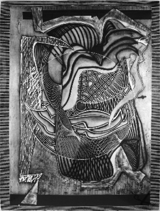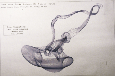 As the last stage of the Smoke sculptures I produced for Frank Stella, I wrote code to calculate cross-sectional slices through the three-dimensional digital forms and used a pen plotter to produce an elaborate series of line drawing construction drawings of the sculptures. While working on these drawings, I realized they were quite extraordinary, and I went to a great deal of trouble to fine-tune their graphics and composition. Stella agreed with me on their impact and asked me to further develop them. In all, I produced over 200 drawings for him. He then used these drawings very extensively in his prints and paintings for over ten years. Below are two examples of the drawings I produced for him, accompanied by several of the many prints and paintings he produced using them.