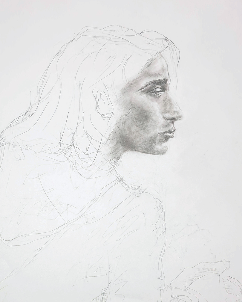 While taking a photo of my partner at a public garden, this young woman and her friend happened to be at the edge of the frame. While her friend busied herself setting up her camera, the young woman sat quietly behind her, gazing off into space and thinking who knows what. My goal in doing these studies was to try to understand what it is about the subtleties of a face -- shapes, contours, swells, hollows, proportions -- that cause us to think it beautiful. Sketches below were based on the accidental photo at the garden.