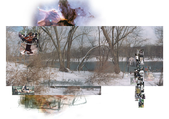 digital prints combining drawing and photographs of urban life, nature, and