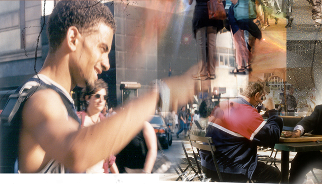A young man on the streets of New York. To his left, a hand-drawn squiggle of charcoal drawing. The graphic lines of the drawing reflect the lines created by the veins of his arm and his thinly cut beard. Elsewhere in the mural, other linear elements appear as well, as in the drawings of the two faces at the top-center. All of these in turn call our attention to similar graphic in many of the other photographic components -- e.g., the water spray lines of the fountain .