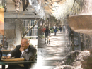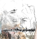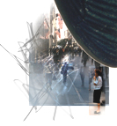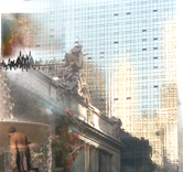 The mural attempts to capture the diversity and tumult of humanity, along with our quieter moments, our longings, our aspirations. The recurring rectangles of imagery echo the rectangular windows of our current visual culture - video screens, film screens, the floating windows of our computer screens - as well as the history of more traditional image-making - painting, printing, drawing. Embedded within the mural is a video screen displaying real-time, processed imagery of the passersby and viewers. In another section of the mural, we hear the faint sounds of overlapping human voices. As we listen more closely, we realize that the voices are speaking poetry, each in a different language.