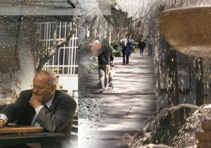 A walkway in a park, people taking their leisure, strolling, playing board games. To the right, faint sounds of human voices are heard coming through the mural wall behind the fountain. As we listen more closely, we realize that the voices are speaking, each in its own language, poetry. The voices intermingle, overlap. Because the poetry is in so many different languages (thirteen), we only sometimes understand what is being said, but we recognize that all of the speakers have felt things similar to what we feel, and that is why we all respond to poetry, whatever our language or background.