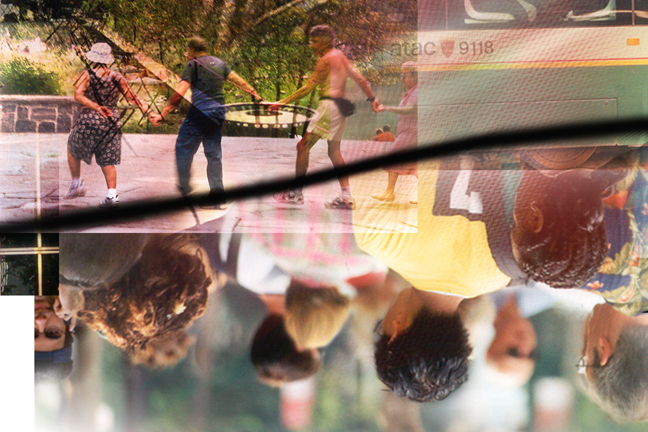 Below, and upside down, a rush of pedestrians in New York City.