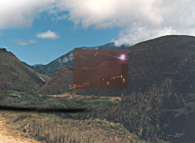 (detail) A landscape of mountains in northern California. Embedded in that image, another image of a moon and jet trail over Brooklyn, NY. Click to see details of the moon image. Click to hear the sounds of nature that emanate from that section of the mural.