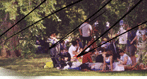 Picnic is a 7'x45.5' multimedia mural. Radiating outwards from the center, image of us, at play, and at work. The mural examines our efforts to understand our place in the world, whether through our private thoughts or our religious practices. The recurring rectangles of imagery echo the rectangular windows of our current visual culture - video screens, film screens, the floating windows of our computer screens. Embedded within the mural are several video screens. One, a pair of screens arranged as a video diptych, displays real-time footage of the us, the viewers, as we look at and move in front of the the mural. Another screen shows a repeating video loop of two people searching a beach for objects. Along the length of the mural, emanating through the mural wall from the two ends and from the middle, we hear faint sounds. This audio plays at a low volume, such that the sounds of children playing, of urban street sounds, and of sounds of nature blend together faintly depending on where you are standing. Click to hear a simulated blending of this audio. Click to see an installation view and a diagram of the multimedia components. The mural can be displayed in its full multimedia version, or as a mural consisting only of static imagery without any video or audio. It also can be exhibited as a smaller scale (22" x 105") tiled print on paper. This composition is also produced as a large-scale print. Additionally, four variations on this mural were developed as smaller prints on paper. Click a section of the mural to see a detail, see video, or hear audio. |