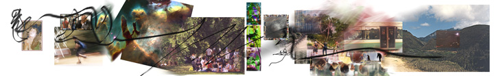 This is a print derived from the Picnic multimedia mural. The image is printed in a limited edition on paper in three sections. When displayed, the three sections are aligned in such a way to make the whole image. Radiating outwards from the center, image of us, at play, and at work. The mural examines our efforts to understand our place in the world, whether through our private thoughts or our religious practices. The recurring rectangles of imagery echo the rectangular windows of our current visual culture - video screens, film screens, the floating windows of our computer screens.