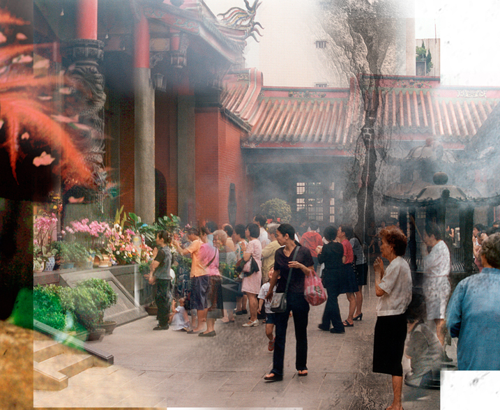 A Buddhist temple with a variety of people praying. Toward the right side of this image, we see a swath of something running vertically. This is, intermingled with the people, a traditional Chinese painting from 1000 years ago.
