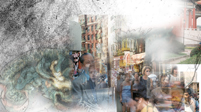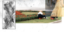 This mural design (unrealized) was intended for the Taipei subway system. It was to be fabricated of 8" square ceramic tiles and to have included still imagery, live video, and audio. The live video was composited in real-time with static imagery. The audio consisted of faint whispering sounds. Click to see a diagram of the AV components.